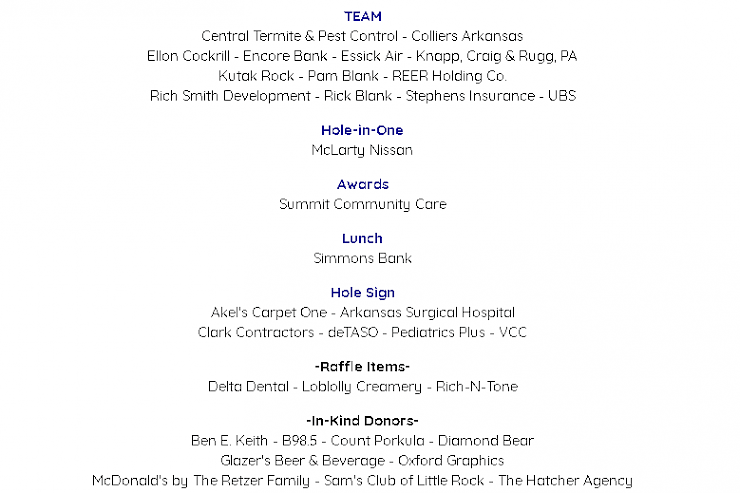Arkansas Beef Council • Arkansas Blue Cross and Blue Shield • Arvest Bank • CenterPoint Energy • Delta Dental • Electric Cooperatives of Arkansas • Legacy Termite & Pest Control • Mainstream Technologies • McDonald's • Mitchell Williams Law Firm • Regions Bank • Uniti Group Inc.