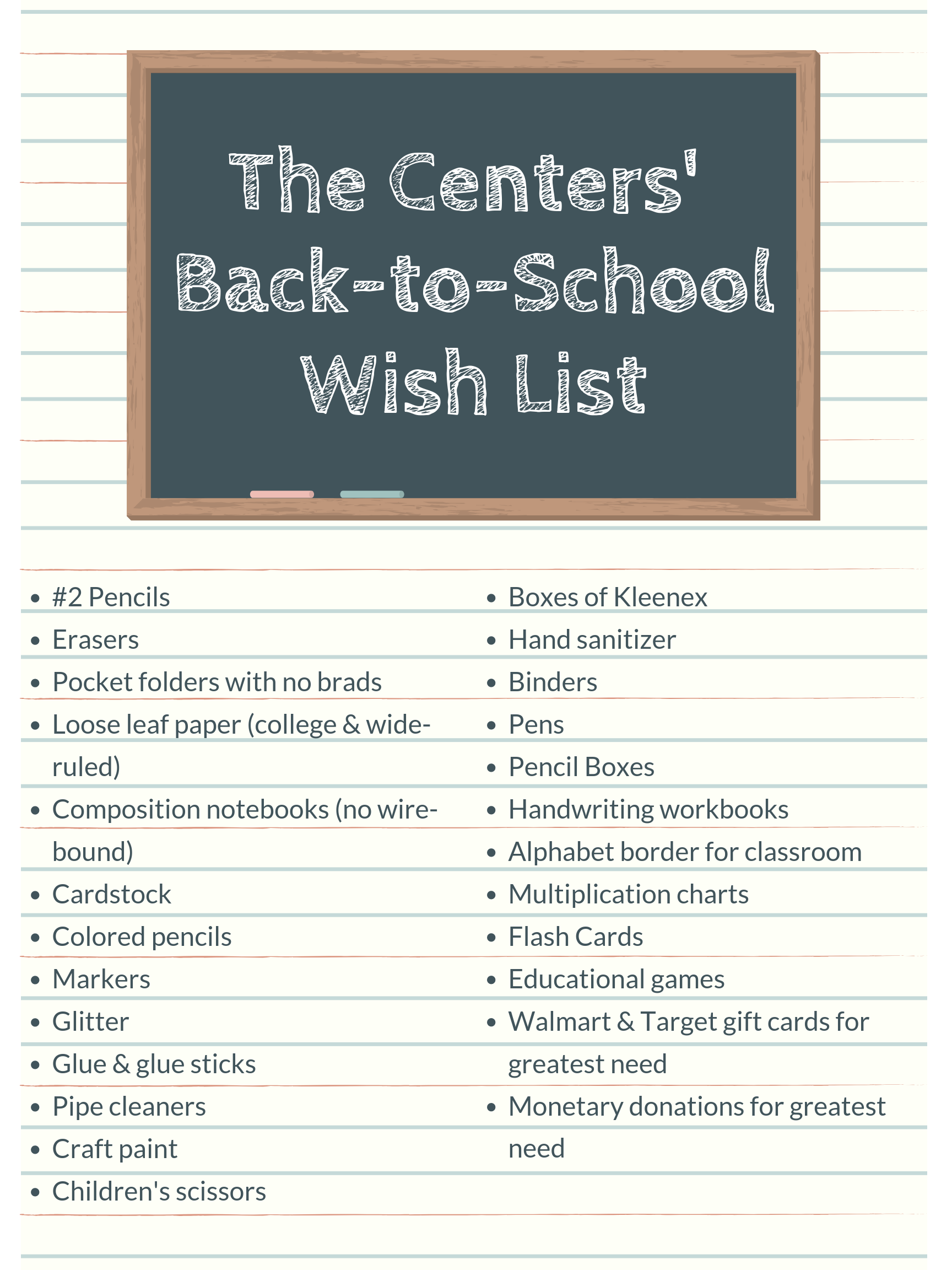 Shop our Amazon Wishlist to provide in-kind gifts of school supplies, personal hygiene products, board games, books, gently-used clothing and recreational supplies to be given to children and youth who live at The Centers or are served by our community programs.